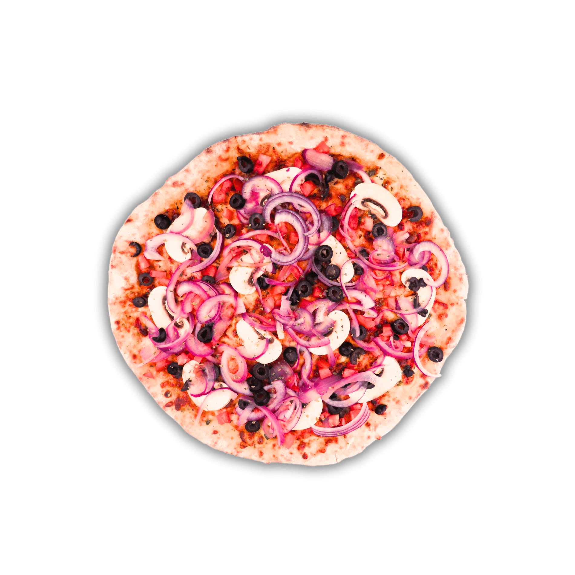 Salsa Pomodoro, Queso Mozzarella, Champiñones, Cebolla Morada, Tomate, Aceitunas
